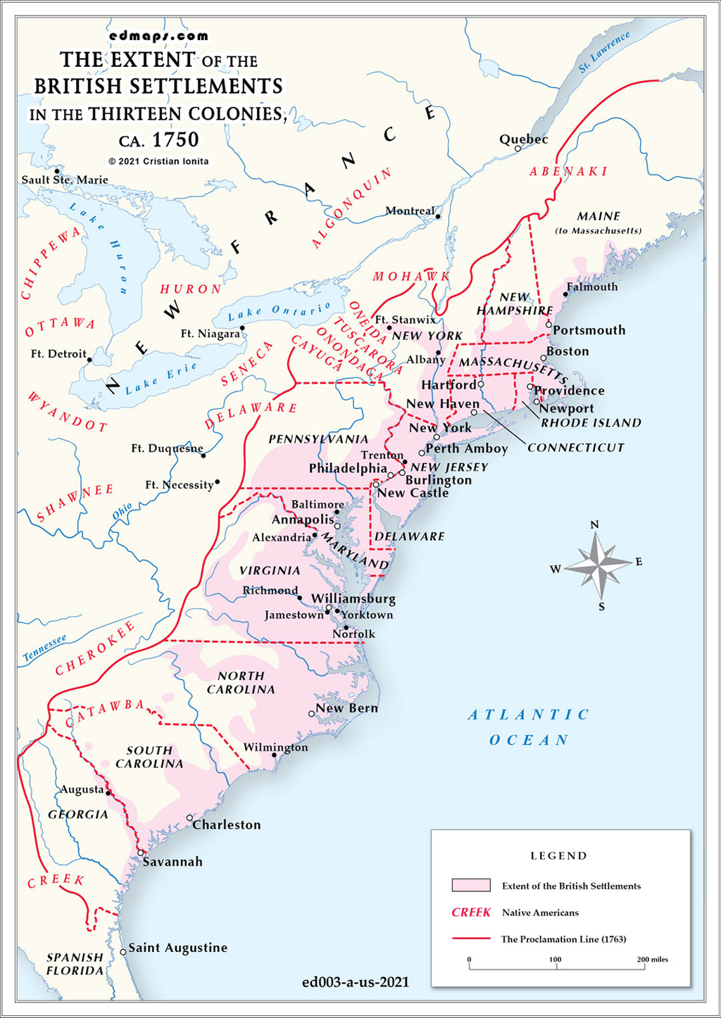 By 1750, British settlements in the thirteen American colonies had expanded significantly from their initial coastal footholds, though they remained largely confined east of the Appalachian Mountains.